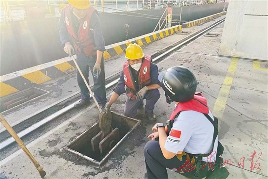 7月23日下午,在东吴港区码头一线,莆田边检站执勤一队移民管理警察与作业工人开展防台风巡查。 谢思勤 摄
