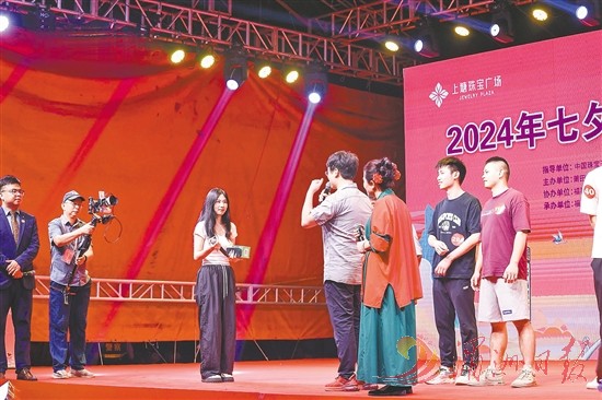 位于秀屿区东峤镇上塘珠宝城的活动现场,灯光璀璨,众多市民携家带口前来品美食、看演出、买东西。网红达人现场“走播”宣传,借力七夕热点,提升上塘银饰小镇知名度。其中,“爱·上塘”青年交友活动是当晚的“重头戏”,启礼相见、揖礼互动、传统文化趣味互动等环节不断将活动推向高潮(如图)。