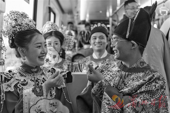 8月10日,新人参加由浙江省金华市民政局与金华市轨道交通集团有限公司联合举办的“缘起金轨、爱在七夕”集体婚礼。当日是七夕,许多新人选择在这一天登记结婚。新华社 发