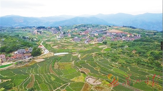 图为航拍下的梅洋村茶园绿意盎然。