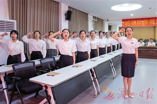9月8日,在第40个教师节来临之际,城厢区举行新教师入职宣誓仪式,引导广大教师牢记为党育人、为国育才初心使命,培养高素质专业化教师队伍。图为新教师代表面向国旗庄严宣誓。许金珊 摄