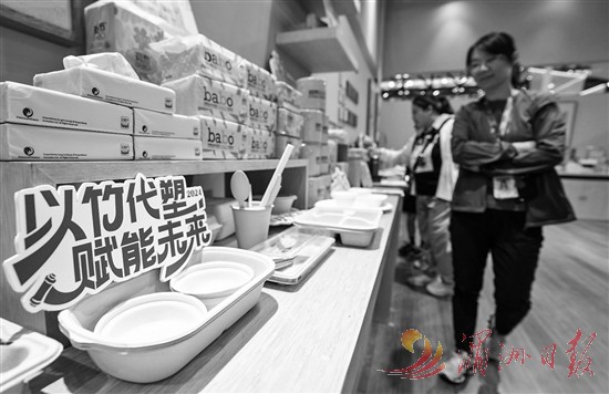 9月14日,参观者在服贸会国家会议中心的国际竹藤组织展位参观。迈入本届服贸会的展会和论坛现场,全球服务贸易绿色化、智能化发展最新成果、最新技术及应用纷纷登场。在为期5天的服贸会上,与会企业纷纷拿出最新的技术成果,展示新质生产力助推绿色低碳转型经验,向世界发出大力发展绿色技术和绿色服务贸易的积极信号。新华社记者 陈晔华 摄