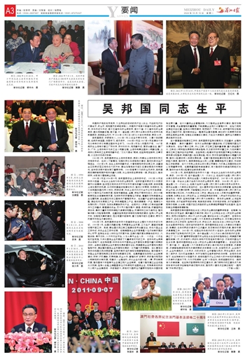 吴邦国同志一生忠于党,忠于人民,忠于共产主义事业。他认真学习马克思列宁主义、毛泽东思想、邓小平理论、“三个代表”重要思想、科学发展观、习近平新时代中国特色社会主义思想,始终在思想上政治上行动上同党中央保持高度一致。他党性坚强,坚持真理,坚持原则,在大是大非问题上旗帜鲜明、敢于担当。他坚定不移推进改革,坚持解放思想、真抓实干,调动和发挥各方面积极性。他坚持实事求是,重视调查研究,深入基层、深入实际,破解工作难题。他心里始终装着老百姓,带着感情做工作,保障人民权益,增进民生福祉。他勤于修身,严于律己,朴素节俭,对家属和身边工作人员严格要求,始终保持了共产党人的政治本色和高尚情操。