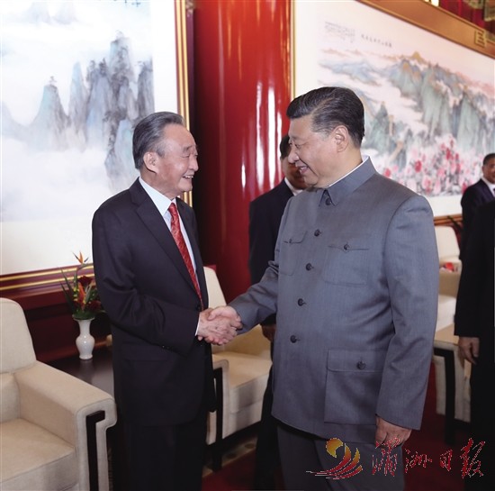 图②:2021年7月1日,庆祝中国共产党成立100周年大会在北京天安门广场隆重举行。这是庆祝大会前,习近平同志与吴邦国同志握手。