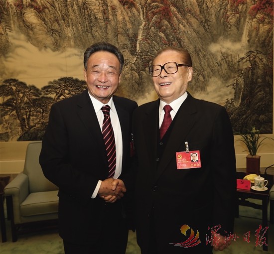 图③:2012年11月14日,中国共产党第十八次全国代表大会在北京闭幕。这是闭幕会前,江泽民同志与吴邦国同志在一起。 新华社记者 兰红光 摄