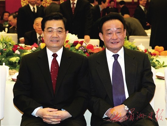 图④:2005年1月1日,全国政协在北京举行新年茶话会。这是胡锦涛同志与吴邦国同志在一起。