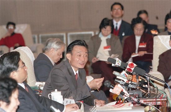 图⑤:1994年3月,时任上海市委书记的吴邦国同志在全国两会上海代表团全团会议上。