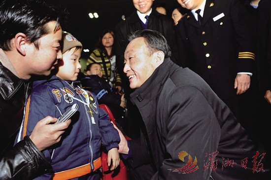 图⑥:2008年2月3日,吴邦国同志在北京西站候车室与旅客交谈。
