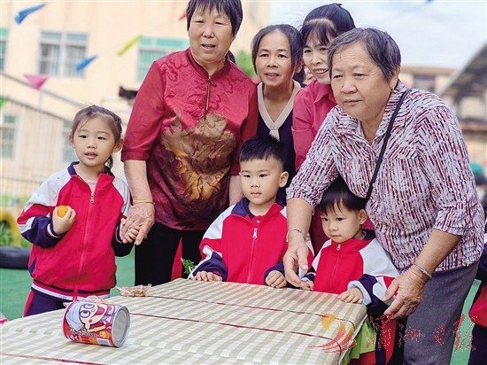 10月11日,笏石中心幼儿园开展“萌娃庆重阳 同乐传孝道”主题活动,通过小朋友与爷爷奶奶共同参与趣味游戏,从小培养孩子尊老孝亲的道德品质。 陈婷 摄