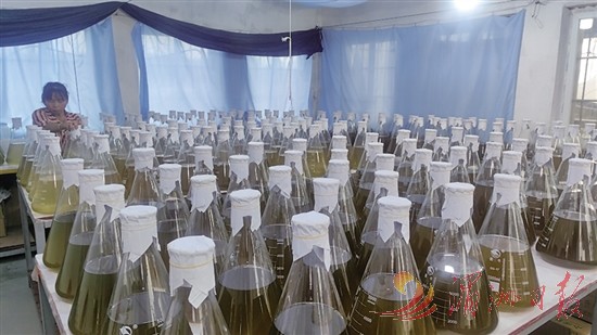 图为莆田市亿星水产科技有限公司工作人员在培育藻类。