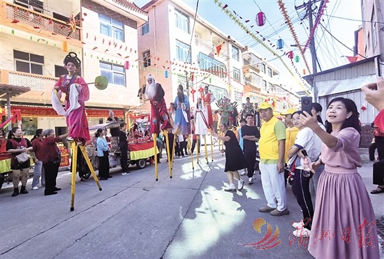 高跷是群众喜闻乐见的民间文艺活动形式。图为11月2日,黄石镇清江村举办踩街巡游活动,众人围观沙坂高跷队表演。全媒体记者 林英 摄