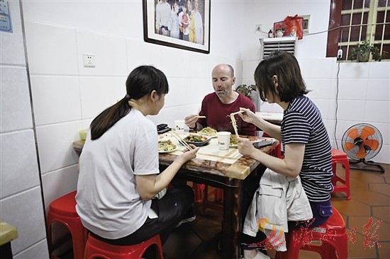 ▲来自英国的游客麦克在朋友的带领下品尝莆田特色美食。