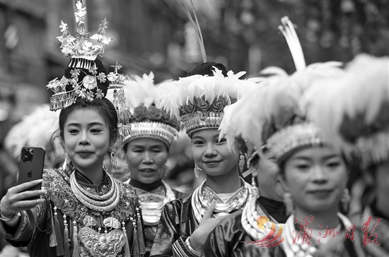 11月30日,在黎平县肇兴侗寨,身穿民族服饰的游客与侗族群众合影。11月29日至12月3日,贵州省黔东南苗族侗族自治州黎平县举行一年一度侗年活动,各地游客与侗族群众欢聚一堂,载歌载舞欢度侗年。