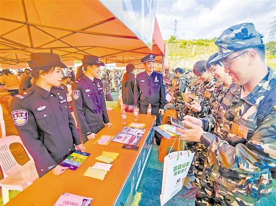 12月5日,莆田出入境边防检查站团支部青年民警赴莆田学院紫霄校区志愿服务集市“法治摊位”,向在校大学生发放移民管理领域普法手册。 吴志 摄