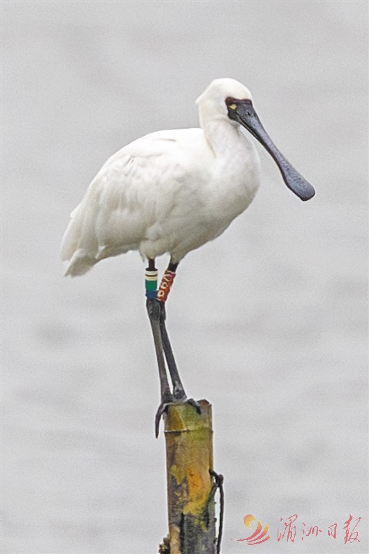 戴着“V99”脚环的黑脸琵鹭昨日再次出现在兴化湾湿地。