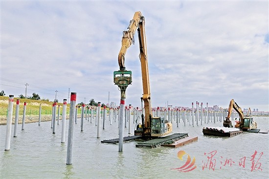 在山亭镇东乌垞村滩涂海域,渔光互补光伏电站项目建设正酣。4台水陆两用打桩机、6台水陆两用挖掘机、挥舞机臂忙碌,运桩、打桩作业。