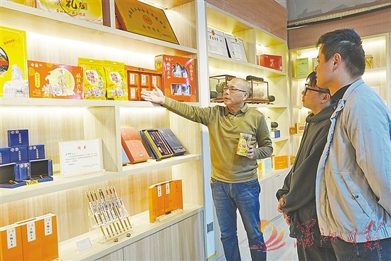 福建益众有限公司立足打造柚类特色产品,将柚子产品与妈祖文化相结合,开发系列伴手礼。图为该公司董事长为顾客介绍妈祖福柚饼产品。全媒体见习记者 杨洲 摄