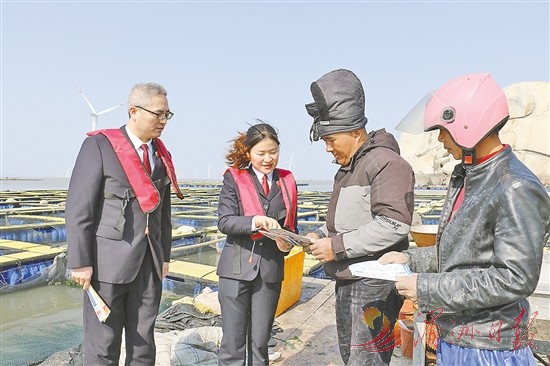近日,秀屿区人民检察院检察干警在养殖鱼排上开展法治宣传,向渔民宣讲养殖污染相关法规政策,提醒规范投放水产饲料,共同维护“蓝色粮仓”的良好生态环境。