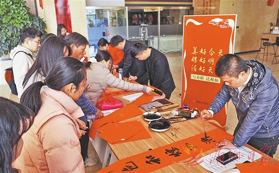 昨日,湄洲日报社开展“美好今天 媒好明天 湄好天天——写春联送祝福”活动,邀请我市书法家为入驻大楼业主和广大职工写春联。图为活动现场。全媒体见习记者 杨洲 摄