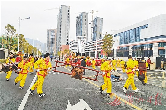 昨日,市木兰溪文献北项目场地内,居民在新建安置房前摆棕轿。 郑一辉 摄