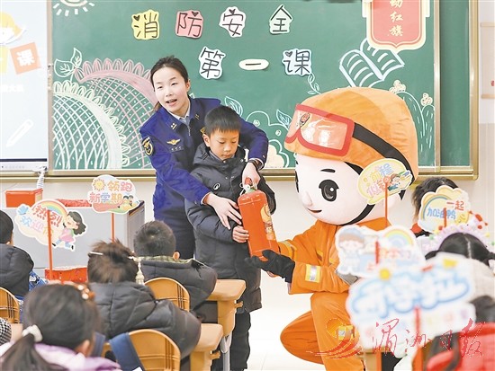 2月13日,消防员在江苏淮安生态文化旅游区沁春路小学给学生讲解消防安全知识。当日,全国部分地区的中小学、幼儿园迎来开学第一天,学生们在形式多样的开学第一课中开启新学期。新华社 发