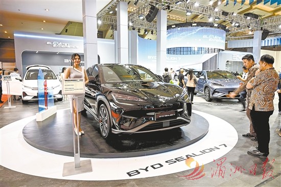 这是2月13日在印度尼西亚雅加达的印尼国际车展现场拍摄的中国汽车品牌比亚迪展台。2025年印度尼西亚国际车展当日在雅加达开幕,众多中国汽车品牌亮相。