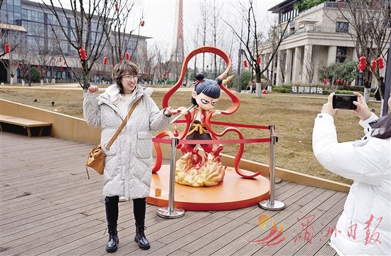 影迷在成都天府长岛数字文创园哪吒形象雕塑前合影。 新华社记者 江宏景 摄