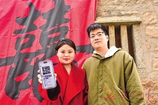 春节元宵期间,在秀屿区月塘镇砺山村,一处民居挂着印有双喜字样的大红布,新婚夫妇郭永杰和李秋盈翻看手机相册,向记者分享旅行结婚的趣事。二人今年春节“零聘金”结婚,在当地引起热议。