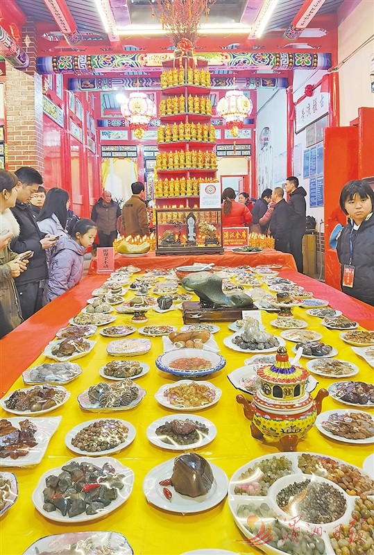 本报讯 (全媒体记者 傅梅香 文/图)今年元宵节期间,涵江区涵西街道延宁宫别具一格的“满汉全席”奇石宴吸引众多游客驻足观看。