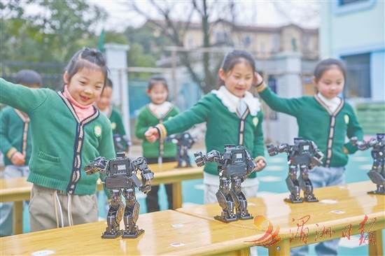 2月19日,诸暨市暨南街道南悦幼儿园的孩子们在拓展课程上观看机器人舞蹈。近年来,随着“双减”政策实施,浙江省诸暨市暨南街道中心学校下属各中小学及幼儿园积极开设包括农耕、木工、人工智能等拓展性课程,促进学生全面发展。新华社记者 徐昱 摄
