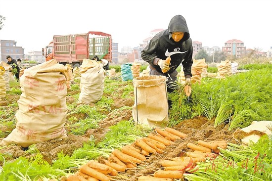 3月1日,在东埔镇何山村胡萝卜种植基地里,一垄垄长势喜人的胡萝卜田绵延铺展,采收工人们正穿梭田间,采摘一根根色泽鲜亮、个头饱满的胡萝卜(如图)。