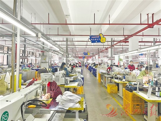 图为电脑针车生产线上,工人加紧生产赶制订单。