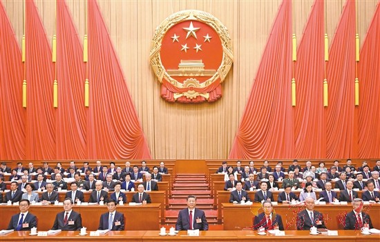 人民大会堂大礼堂气氛庄重热烈,主席台帷幕正中的国徽与会场穹顶上的五角星灯交相辉映。