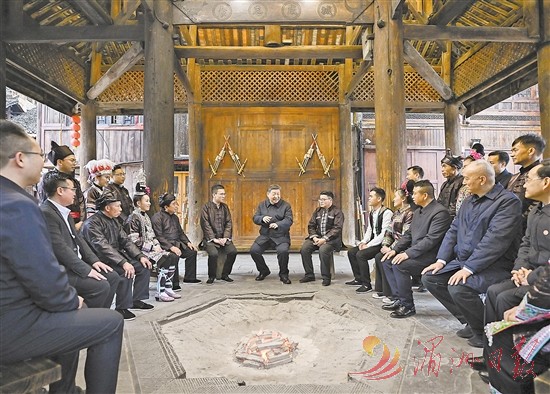 在信团鼓楼,习近平同村干部和村民代表围坐一起亲切交流。大家争相向总书记讲述近年来村寨发生的可喜变化。习近平表示,看到侗寨保护得这么好,侗族群众生活幸福,感到很欣慰。他指出,办好老百姓的事,关键在于加强农村基层党组织建设,发挥党支部战斗堡垒作用和党员先锋模范作用,带领群众发展经济、搞好乡村治理。