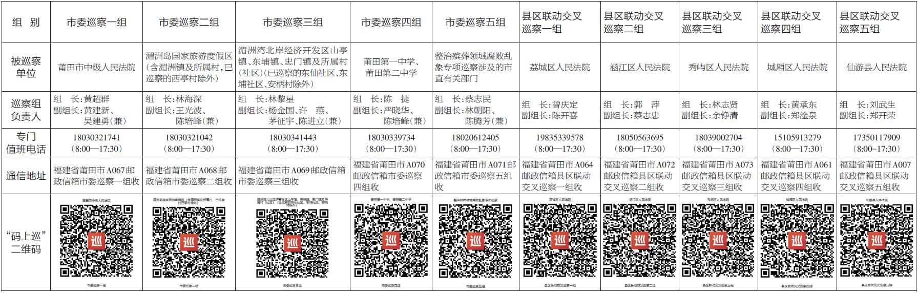 根据党中央关于巡视巡察决策部署及省委、市委工作要求,经市委巡察工作领导小组研究决定,从3月中旬开始,市委巡察组对莆田市中级人民法院,莆田第一中学、莆田第二中学,湄洲岛国家旅游度假区(含湄洲镇及所属村,已巡察的西亭村除外),湄洲湾北岸经济开发区山亭镇、东埔镇、忠门镇及所属村(社区)(已巡察的东仙社区、东埔社区、安柄村除外)等党组织开展常规巡察;对市直有关部门开展整治殡葬领域腐败乱象专项巡察。巡察时间30天左右。日前,巡察组已进驻巡察。