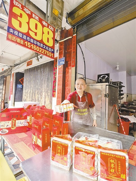 枫亭糕产自仙游县枫亭镇,历史逾千年,是当地传统糕点。枫亭糕以纯糯米粉为主料,配以白糖、花生仁、芝麻等,经传统干蒸工艺制成方块状,口感香甜软糯,风味独特,广受消费者喜爱。图为4月2日,枫亭老街上的一家枫亭糕店铺前,店主正在介绍枫亭糕。