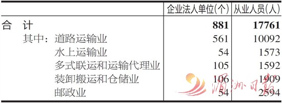 2023年末,全市共有交通运输、仓储和邮政业企业法人单位881个,从业人员17761人,分别比2018年末增长42.1%和19.3%(详见表4-4)。