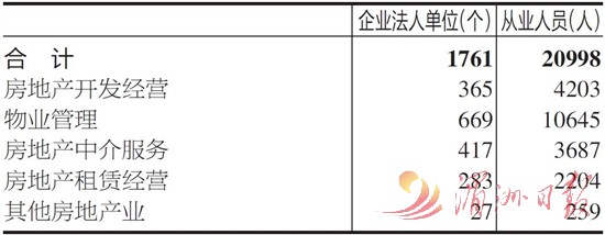 2023年末,全市房地产业企业法人单位从业人员20998人,比2018年末增长34.0%。其中,房地产开发经营企业4203人,比2018年末下降36.7%;物业管理企业10645人,房地产中介服务企业3687人,分别比2018年末增长70.2%和93.7%(详见表4-13)。