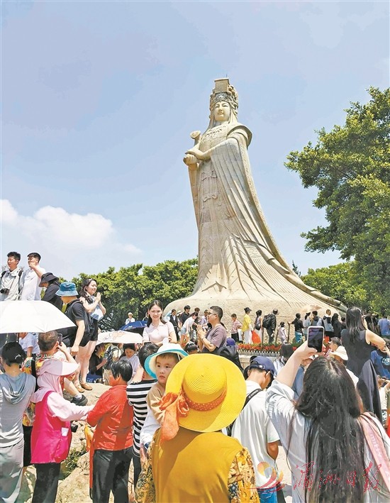 “五一”假期,湄洲岛游客如潮。图为5月2日,游人在湄洲岛妈祖石雕像前打卡拍照。