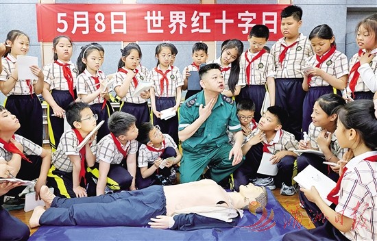 5月7日,在山东省枣庄市市中区文化路小学,医务人员为学生讲解心肺复苏急救知识。世界红十字日将至,各地开展形式多样的活动,普及急救知识、提升应急救护能力。