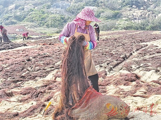 连日来,在秀屿区南日岛,养殖户抓紧采收、晾晒龙须菜。龙须菜既可做喂养鲍鱼的饵料,又可作为果冻厂等厂家的原材料,是当地养殖户的重要经济收入来源。