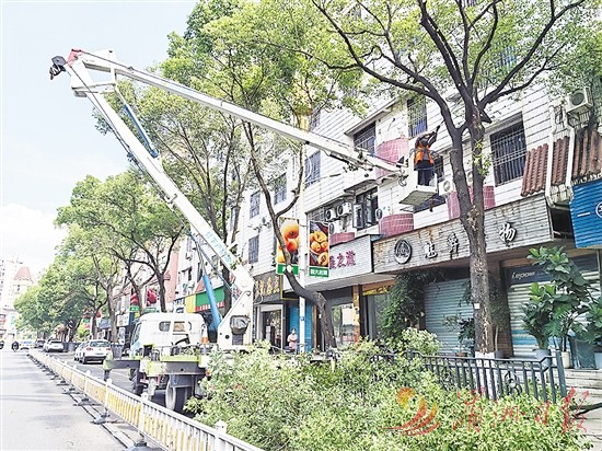 初夏,行道树生长旺盛,部分枝叶遮挡了交通信号标识。为消除安全隐患,我市组织工人对市区主干道两旁的树木进行集中修剪。图为5月中旬,在市区东园路,工人们利用高空作业车对行道树进行修剪。