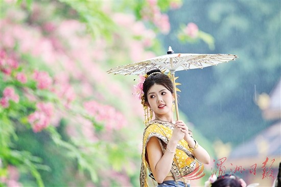 5月25日,游客在雨中的云南省景洪市曼听御花园景区拍照。微风轻拂,鲜花绽放。人们走进大自然,拥抱初夏的美好,用运动和欢笑开启夏的活力乐章。 新华社 发