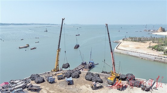 时值海带收成季节。5月18日,北岸经开区山亭镇山柄村渔民在海上收割海带。