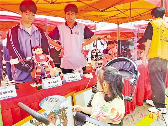 本报讯 (全媒体记者 傅梅香 文/图)5月23日,在2025年莆田市职业教育活动月职教成果展上,湄洲湾职业技术学校学生郑昱宸研发的“哪吒”舞蹈机器人以其灵动炫酷的表演引人关注(如图)。
