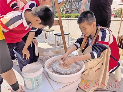 图为学生体验陶瓷制作拉坯。