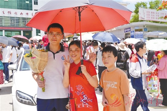 本报讯 (全媒体记者 郭珊珊)6月7日,莆田十中考点,9岁男孩陈金鸿穿着红色旗袍,攥着舅妈递来的寓意“一举夺魁”“未来可期”的两朵向日葵,为参加高考的表姐加油。