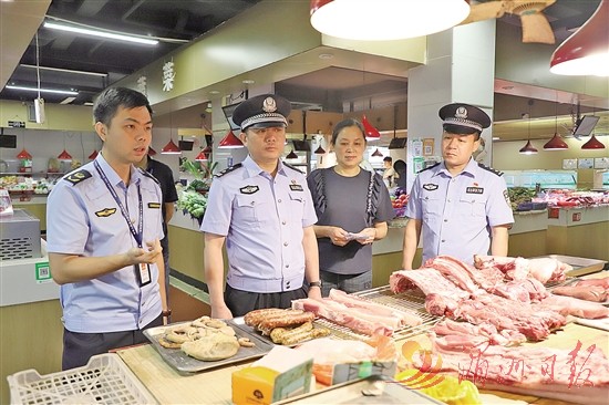图为黄世雄(左二)带队对肉制品经营户开展“拉网式”排查。