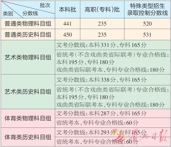 本报讯 昨日,福建省2025年普通高考成绩公布,普通高考录取控制分数线也划定(见图表)。其中,普通类物理科目组的本科批441分、比去年低8分,高职(专科)批235分,特殊类型招生录取控制分数线520分、比去年低18分;普通类历史科目组的本科批450分、比去年高19分,高职(专科)批235分,特殊类型招生录取控制分数线531分、比去年高12分。