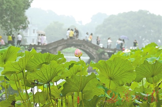 6月24日,人们在曲院风荷景区赏荷。近日,浙江杭州西湖荷花进入花期。西湖水域共有24块荷区,总面积约150亩,花期将持续至9月初。新华社记者 翁忻旸 摄